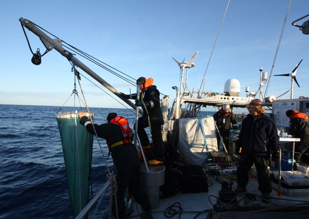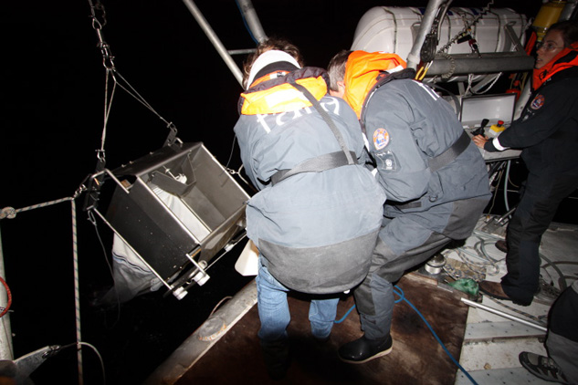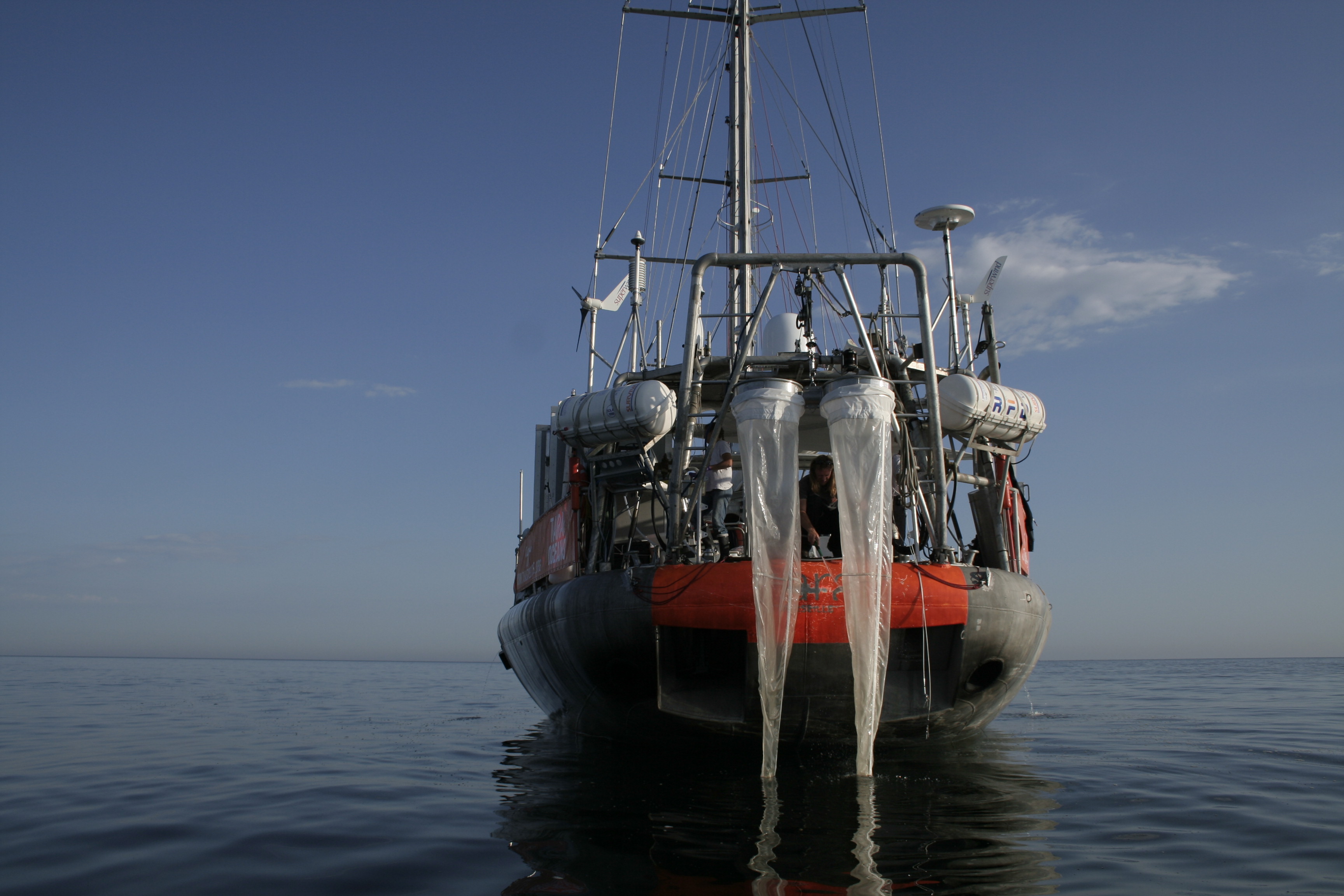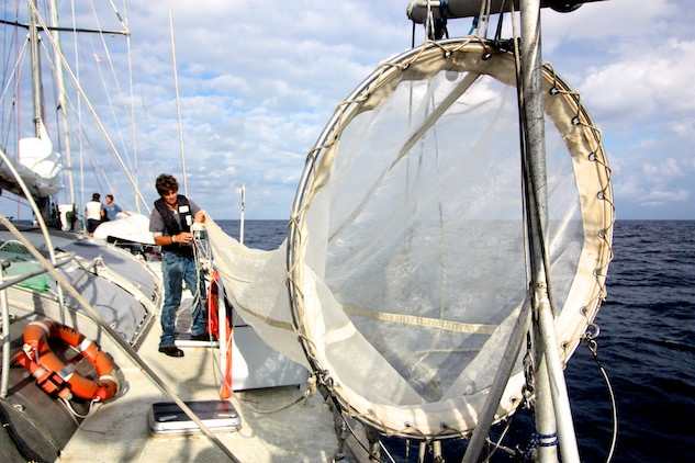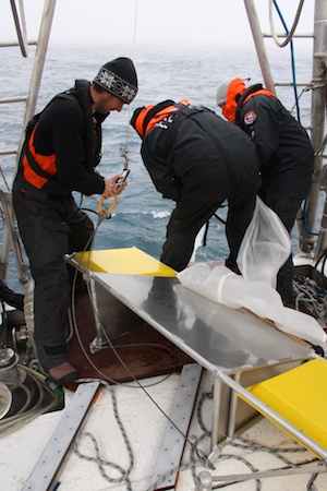Lors d'une station de prélèvement, les derniers instruments scientifiques à entrer en action sont les filets. Ils sont descendus à différentes profondeurs, parfois à l'aide d'un poids, selon ce que l'on cherche à échantillonner. C'est au cours de leur remontée qu'ils «pêchent » jusqu’à la surface tous les animaux et les organismes plus petits que leur maille, sur leur passage. Le contenu du collecteur est ensuite vidé, filtré et recueilli dans de petites bouteilles puis transvaser dans les tubes et microtubes... Les filets sont soigneusement rincés pour ne pas garder de traces des organismes. Ils sont ensuite séchés sur le pont du navire et stockés jusqu’à la prochaine station d’échantillonnage.